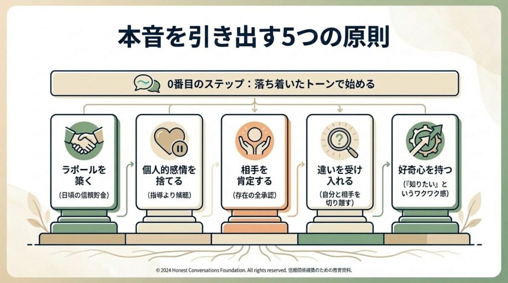このような怒りの琴線に無暗に触れることなく本音を聞き出したい時ほど、意識的に「落ち着いたトーン」でスタートを切ることは、話合いの環境調整に不可欠です。